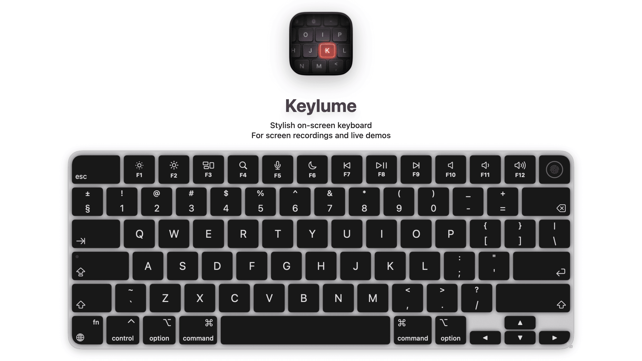 Keylume is an on-screen keyboard for macOS that lights up keys as you press them. Made for app demos, screencasts, and tutorials.