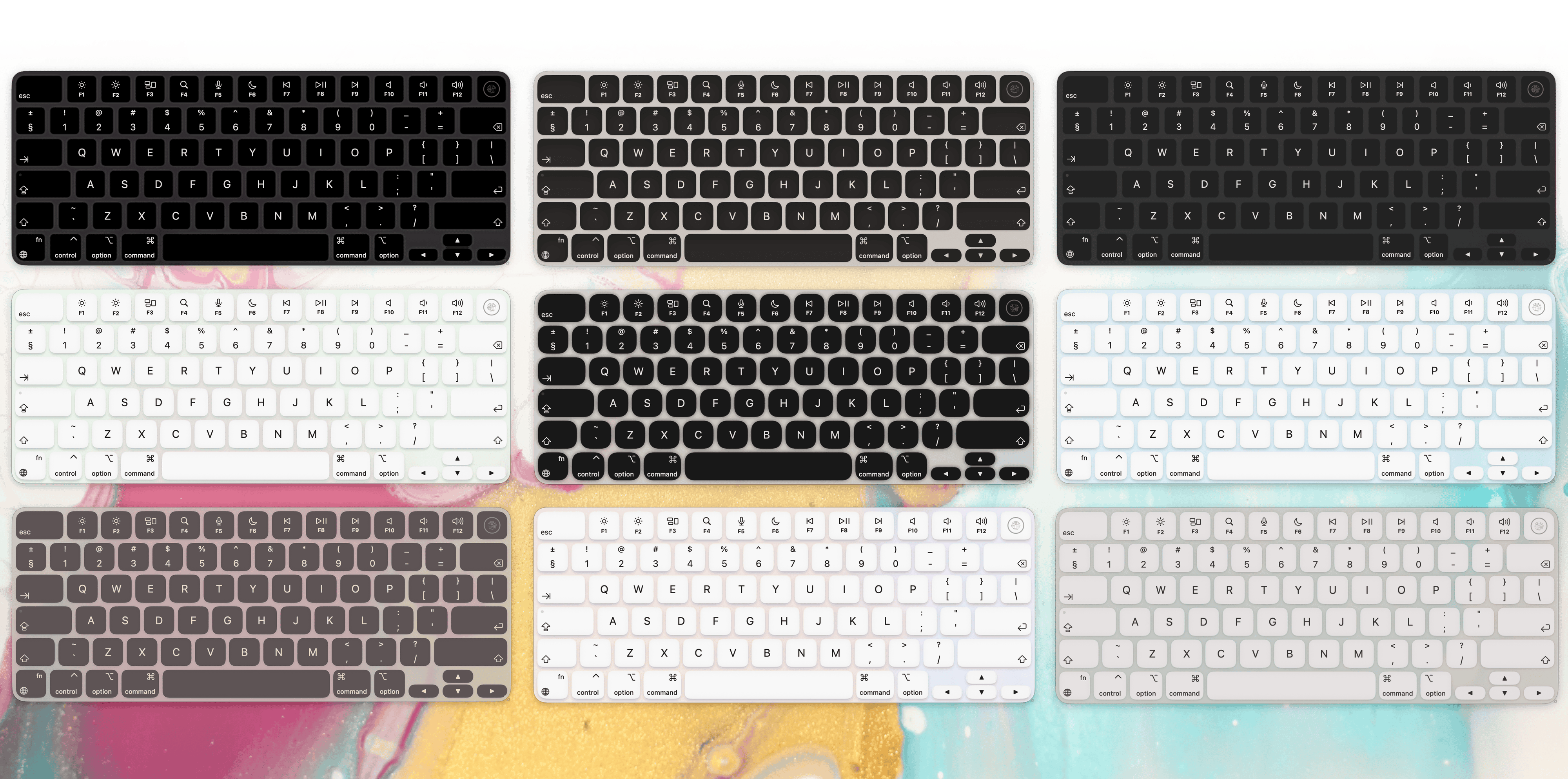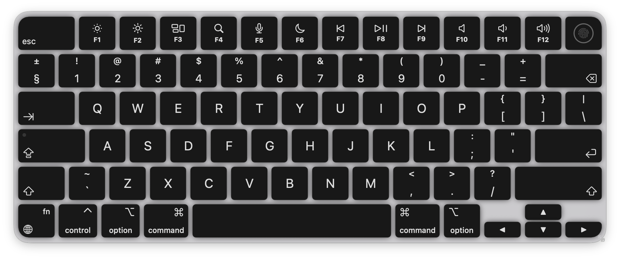 - Full MacBook layout with every key, including media keys, arrows, and modifiers