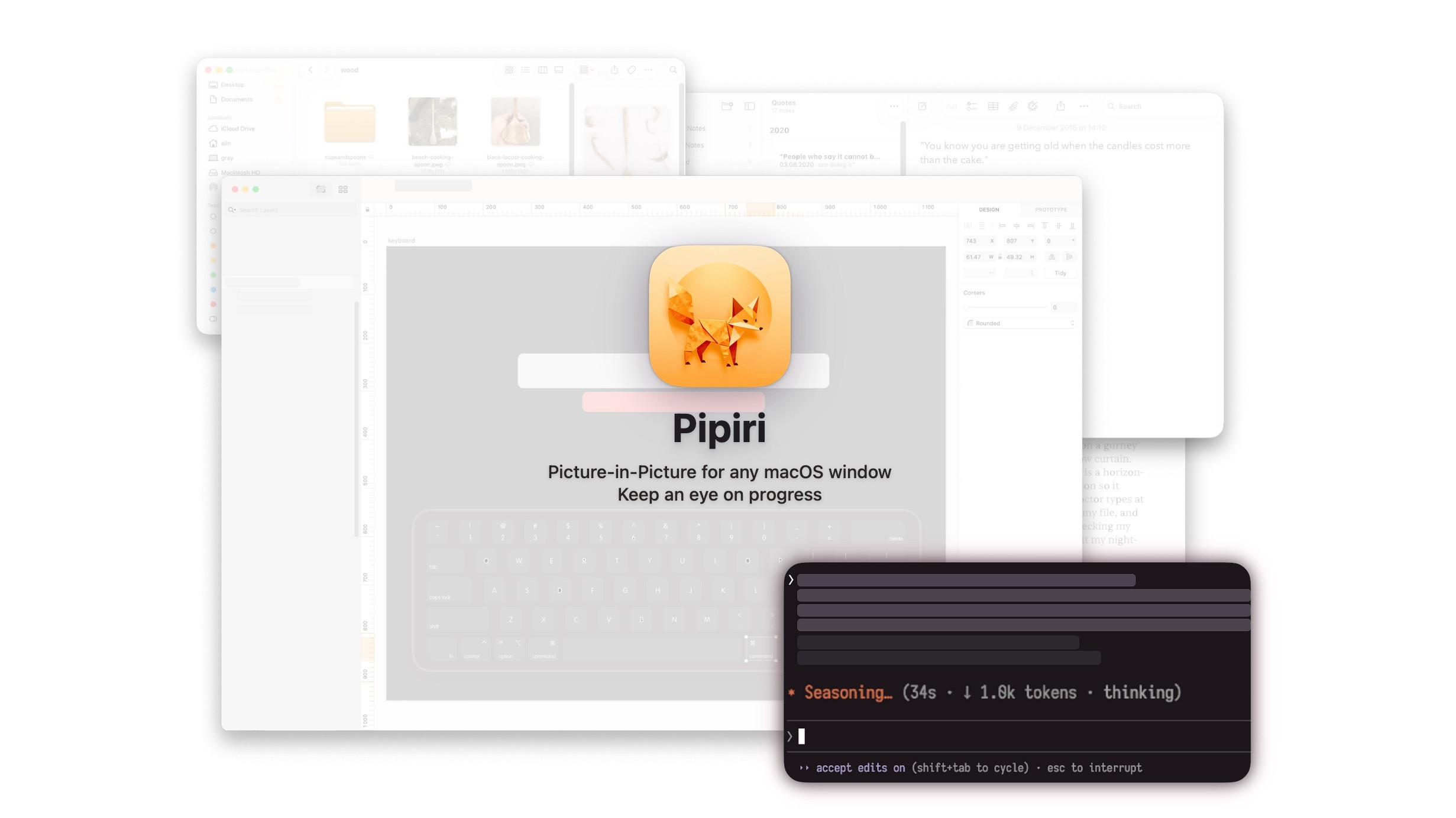 Pipiri is a Picture-in-Picture app for macOS. Press a hotkey and the focused window becomes a floating panel that stays on top across all Spaces. It works with any window, not just video players.